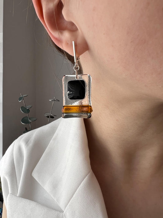Amber Black Fused Glass Earrings – Minimalist Silver Geometric Jewelry